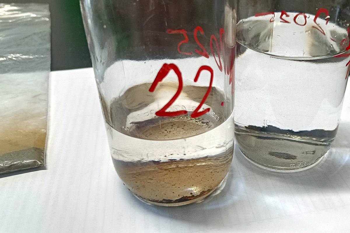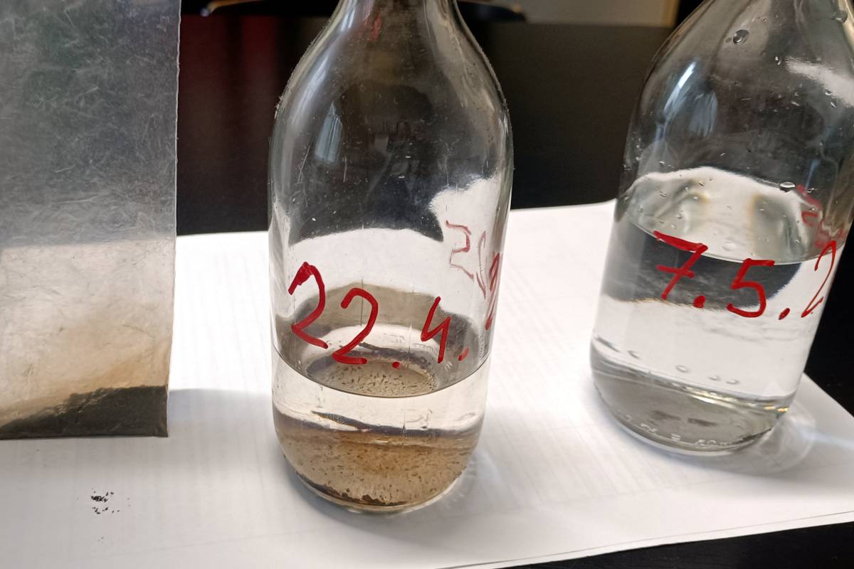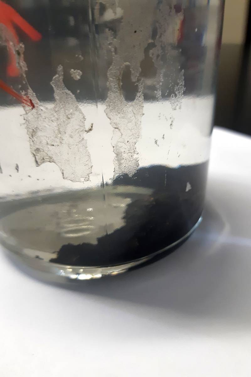 Filtr byl instalován přímo do potrubního systému během plánované odstávky. Po zhruba měsíci provozu proběhla kontrola a odkalení – a výsledek byl jednoznačný. Magnetické tyče zachytily velké množství kovových abrazivních částic, což potvrzují i fotografie vzorků kapaliny ve skleněných vzorkovnicích po sedimentaci.