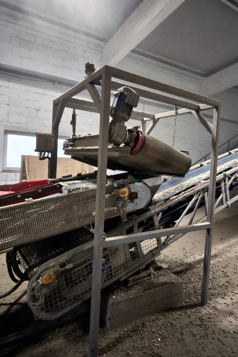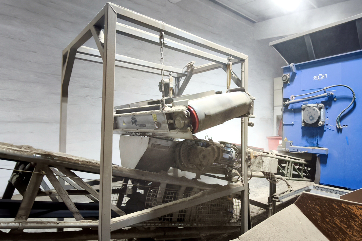 Nad pásový dopravník byla instalována magnetická deska samočisticí DND-AC, zavěšená napříč dopravníku. Jejím úkolem je spolehlivě zachytit železné hřebíky přímo z proudu drceného materiálu – bez zásahu obsluhy a bez přerušení provozu.